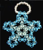 Une décoration en forme d'étoile à 5 branches, réalisée en deux couleurs de toupies Swarovski dans les tons bleus aquamarines.