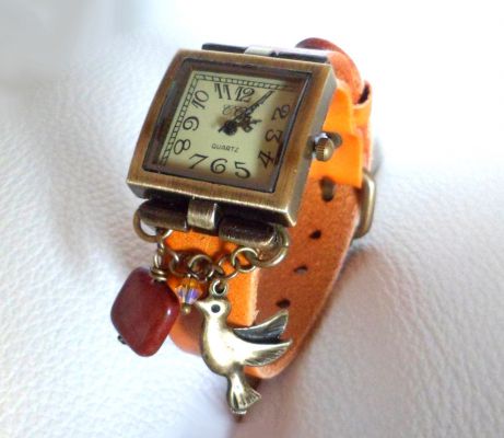 Montre rétro au cadran carré vintage et bracelet large en cuir carmel oranger au décor Oiseau et pierre naturelle