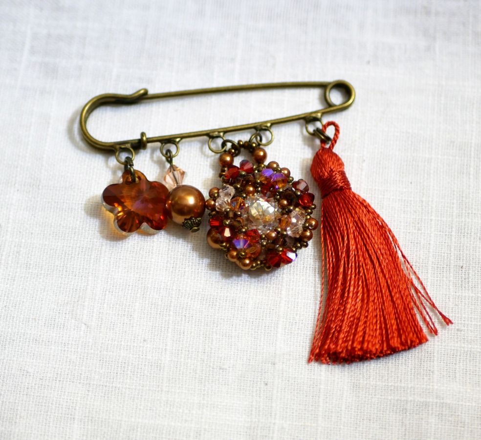 Une broche tendance été chaud avec sur l'épingle à kilt : un beau bijou pendentif tout en perles de cristal Swarovski dans les tons Rouge, Ocre, Cristal et cuivré, accompagné d'un superbe pompon en rayonne 7 cm couleur paprika, d'une breloque de perles en cristal Swarovski Cuivre et pêche, d'un très joli pendentif cuivré en cristal Swarovski en forme de fleur.