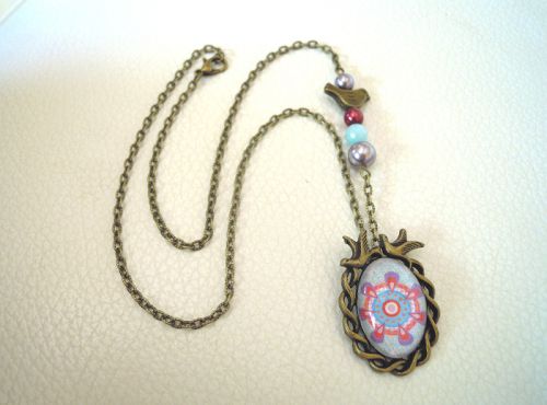Esprit vintage et poésie pour ce collier pendentif au cabochon loupe aux motifs géométrique et aux tons clairs à dominante bleu ciel, sur un médaillon bronze décoré d'oiseaux, porté par une chaîne sur laquelle est attaché un ensemble de perles avec un oiseau bronze, des perles nacrées mauve Swarovski, une perle opale bleu ciel, une perle métallisées rouge fuchsia.