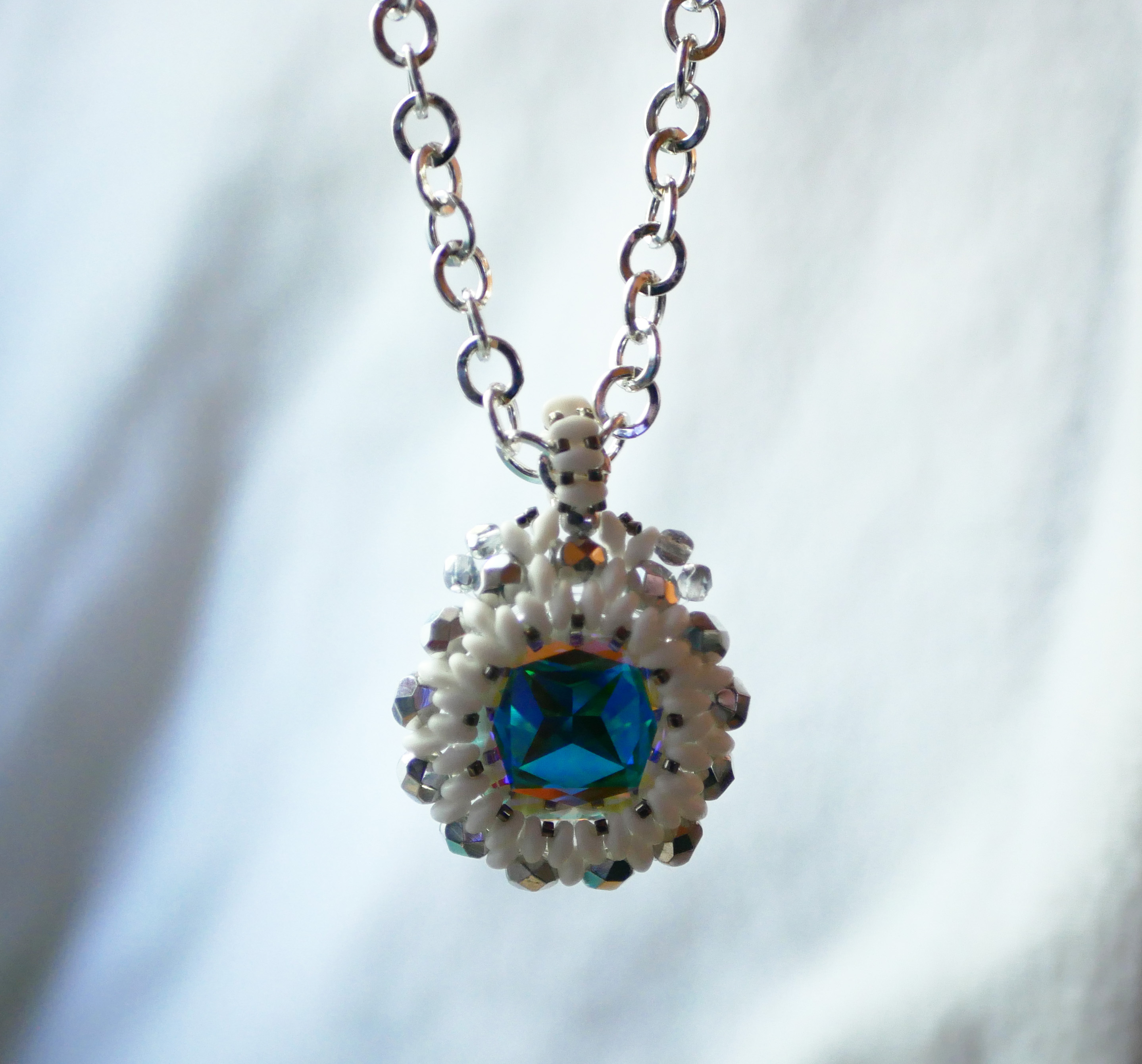 Un large cabochon carré en cristal Swarovski est serti de perles Super Duos blanches et de facettes argentées.