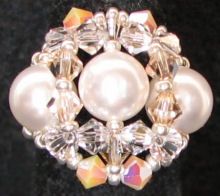 Les perles rondes nacrées blanches et les toupie sont en cristal Swarovski. Anneau en facettes et rocailles argentées.