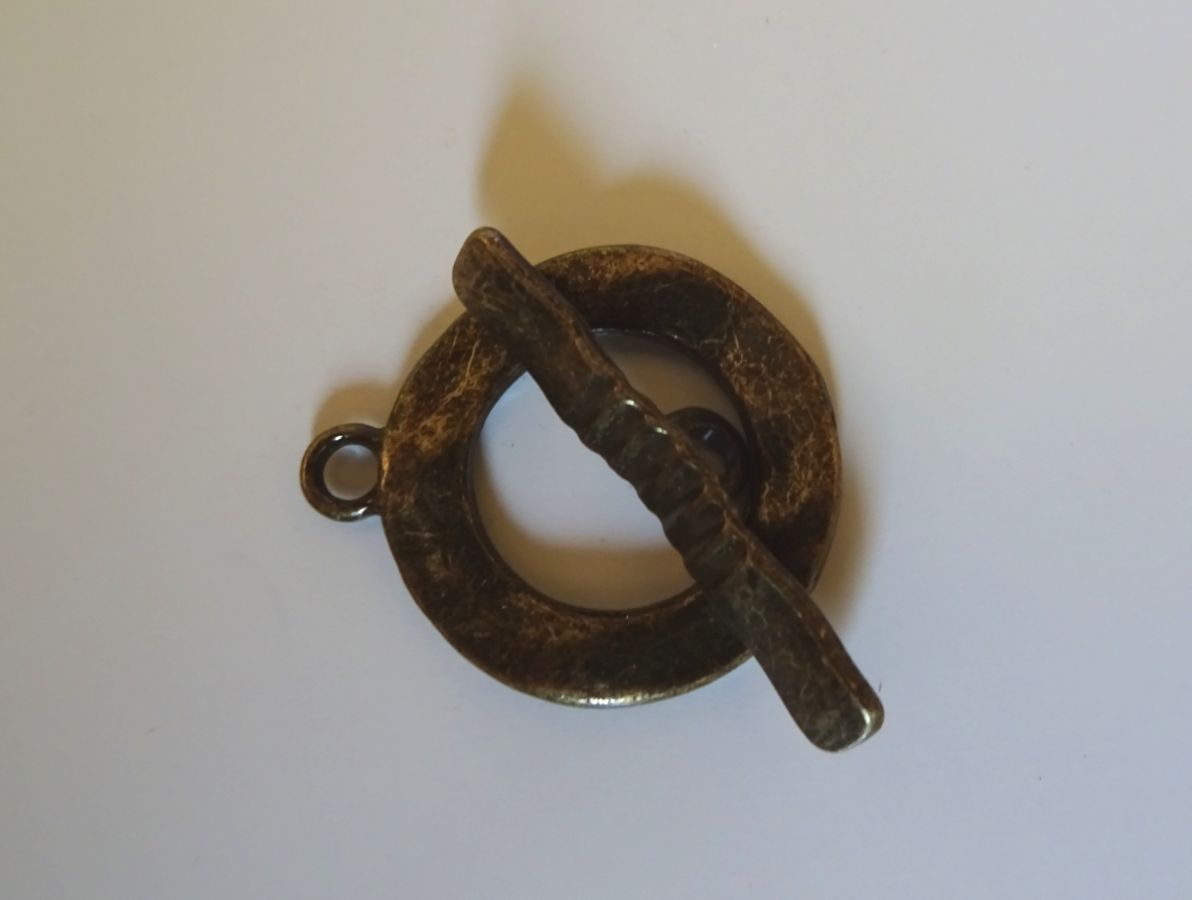 Fermoir en T en métal bronze vieilli en forme d'un large anneau plat et martelé de 20mm de diamètre.
