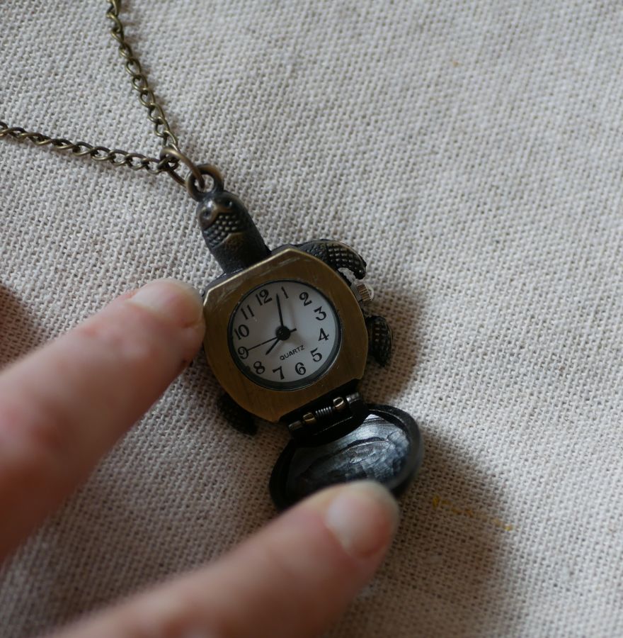 Une montre gousset en forme de tortue sur une longue chaîne, coloris bronze vieilli.