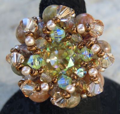 Autour d'un cabochon Crystal Luminous Green (une des dernières couleurs Swarovski, un vert clair aux reflets irisés), des perles naturelles en pierre d'Unakite, des mini perles nacrées couleur champagne et des toupies Swarovski ab2x en contraste : autant de composants réunis sur ce petit bijou... Des facettes Camaïeu beige et des rocailles bronze doré complètent cette bague.