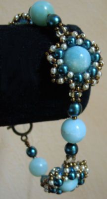 Le tutoriel du bracelet de la parure Twinétoile Amazonite : trois médaillons à la forme étoilée, chacun composé autour d'une belle perle naturelle d'un vert-bleu tendre ré-haussé de perles nacrées bleu touareg et associées à des perles Twin bead, des mini-nacrées pêche clair, des facettes duo Bleu Capri / turquoise.
