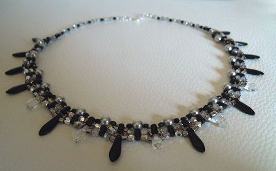 Un élégant collier ras-du-cou à la tonalité Noir / Gris / Argent / Cristal, parfaitement assorti à la bague Dagos Noir Crystal, avec des perles rullas et des dagues Noires, des gouttes à facettes et des nacrées gris clair en cristal Swarovski, des Delicas et des facettes assorties.