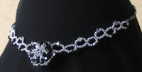 Un pendentif en relief à la forme étoilée, composé, comme pour la bague assortie, de toupies à cônes argenté sur cristal et de toupies noires. Rocailles argentées. La notice est composée de schémas en couleur et d'explications détaillées.