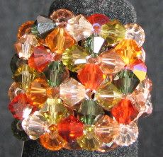 Une bague au carré bombée, presque cubique. Réalisée toute en cristal : cristal Swarovski pour la partie visible en toupies dans les couleurs assorties à la pierre naturelle Unakite, cristal tchèque pour la partie non visible et l'anneau composé de petites facettes (aucune rocaille dans ce modèle).