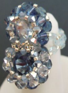 Deux cabochons carrés Swarovski, de tailles différentes, sont réunis dans cette bague originale de 30 mm de haut (et 20 mm de large) : l'un est couleur Denim blue, l'autre d'un cristal transparent . Ils sont sertis par des toupies Denim blue et cristal argentées avec de petites toupies bleu argentées ; ils reposent sur un lit de facettes en cristal d'un bleu plus soutenu. En contraste, des Delicas japonaises argentées et brillantes.