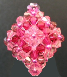 Pas moins de 5 coloris roses Swarovski différents, du plus clair au framboisine, pour cette bague en losange ré haussée de fleurs en cristal Swarovski dans ses angles haut et bas. Jolies rocailles métallisées fuchsia.
