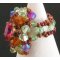 De la couleur ! Une navette fuchsia, serti de cuivre, est entourée de toupies vert tendre et orangé, encadrée de toupies Violet foncé aux subtils reflets ab2x. Navettes et toupies sont en cristal Swarovski et montées sur des facettes Picasso ambre dorée,les rocailles sont bronze rosées.