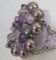 Une bague ronde, confectionnée avec des perles rondes nacrées Swarovski mauves, éclairée par des toupies Swarovski aux tendres couleurs parmes. Rocailles argentées, anneau large.