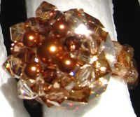 Superbe pierre de cristal facettée, 18mm de diamètre (ref Swarovski 5041) en coloris Crystal Golden shadow, est surmontée d'un montage en étoile de petites perles nacrées et de toupies Swarovski assorties.