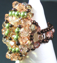 Une bague ovale, construite autour d'une harmonie de couleurs Swarovski : le vert clair des prles nacrées, les couleurs pêche et soie du cristal. Des tailles de perles différentes pour une nouvelle forme de bague, de 28 mm de haut mais tout en finesse.
